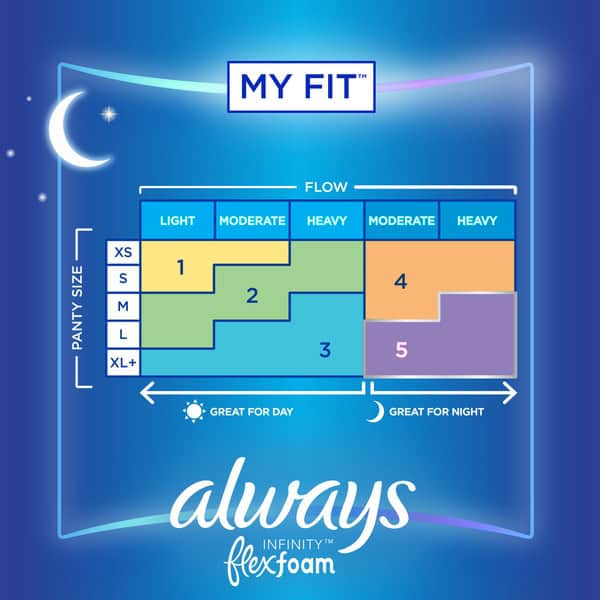 Try Always Infinity FlexFoam for a pad that feels like nothing and protects like nothing else! With Always Infinity FlexFoam pads a Zero Leak and Zero Feel period is possible. FlexFoam pads absorb up to 10x their weight. FlexFoam pads are unbelievably thin and flexible, so your pad moves with you, not against you. Zero Feel protection is possible with our driest, breathable top layer, and super absorbent holes that pull wetness away from your skin. Always FlexFoam pads are dermatologically tested, and approved as skin friendly by the Skin Health Alliance. Always products are FSA/HSA Eligible.Always Infinity pads are made with FlexFoam, Not Fluff. With Always Infinity FlexFoam, the holes and slots in the core pull fluid away from your body and distribute it to the bottom of the pad. So, it absorbs more and leaves you feeling drier, for protection that doesn’t hold you back.Always Infinity FlexFoam pads offer up to 12 hours of overnight leak-free, Zero Feel protection. Each pad’s moisture wicking technology ensures you stay clean and fresh throughout the night. In addition, they also have a breathable top layer that keeps you feeling dry all night long, so you can say goodbye to hot and stuffy.
