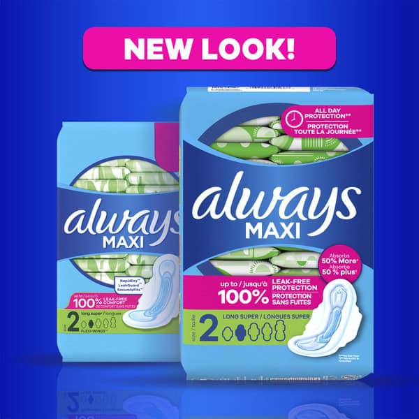 If you’re looking for uncompromised period protection, you’ve come to the right place. Always Maxi Pads ABSORB 50% MORE vs. same size Always Ultra Thin. Additionally, Always Maxi Pads also feature the Always advanced 3X Protection System to give you up to 100% leak free protection throughout your days and nights. Always Maxi Pads possess RapidDRY Technology, which works to wick away gushes fast to absorb more than you may need. The LeakGUARD core locks in leaks for long-lasting protection to keep you fresh and clean, and SecurelyFITS helps the pad stay in place throughout no matter what you do. Make sure that you are getting the right protection from your pad, as using the wrong pad size can lead to leaks. Always Maxi Pads come in a range of sizes fit your flow and size perfectly depending on your needs. If you have a light flow or need a teen-sized pad, then we would recommend using our Always Maxi Pad size 1 to 3. If you have a heavy flow or want overnight protection, then we recommend using our size 4 or 5 Always Maxi Pad. We’ve got your flow covered day and night for up to 100% leak-free comfort.