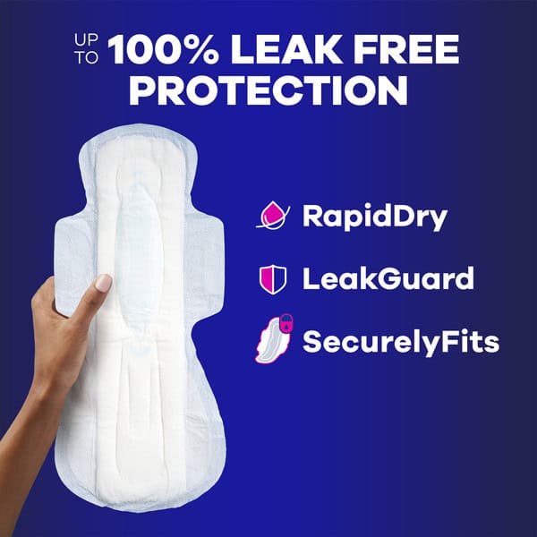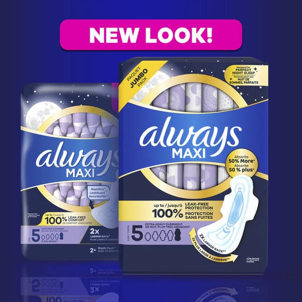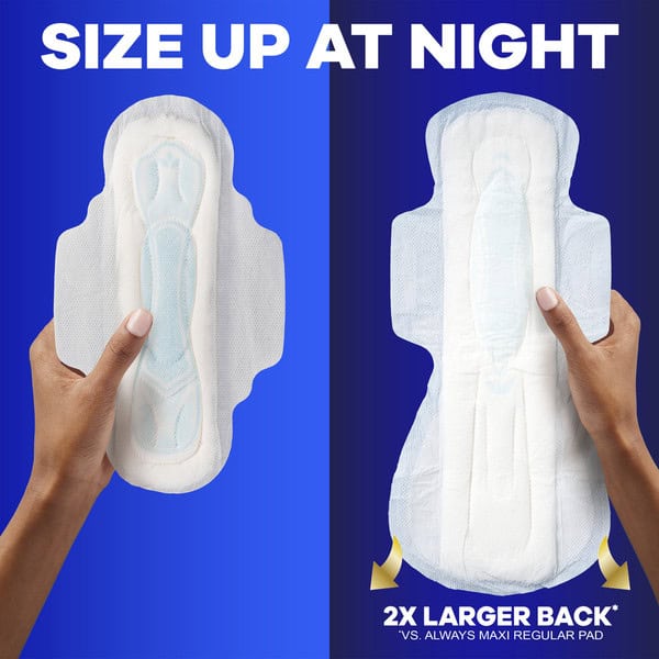 Always Maxi Overnight Pads provide you a PERFECT NIGHT SLEEP with 2X more coverage on the back for up to 100% Leak Free Comfort, no matter how you sleep. If you’re looking for uncompromised period protection, you’ve come to the right place. Always Maxi Pads ABSORB 50% MORE vs. same size Always Ultra Thin. Additionally, Always Maxi Pads also feature the Always advanced 3X Protection System to give you up to 100% leak free protection throughout your days and nights. Always Maxi Pads possess RapidDRY Technology, which works to wick away gushes fast to absorb more than you may need. The LeakGUARD core locks in leaks for long-lasting protection to keep you fresh and clean, and SecurelyFITS helps the pad stay in place throughout no matter what you do. Make sure that you are getting the right protection from your pad, as using the wrong pad size can lead to leaks. Always Maxi Pads come in a range of sizes fit your flow and size perfectly depending on your needs. If you have a light flow or need a teen-sized pad, then we would recommend using our Always Maxi Pad size 1 to 3. If you have a heavy flow or want overnight protection, then we recommend using our size 4 or 5 Always Maxi Pad. We’ve got your flow covered day and night for up to 100% leak-free comfort.