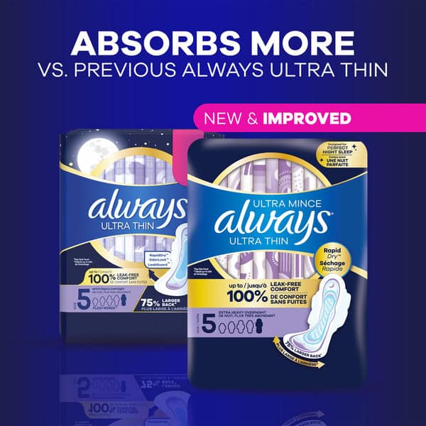 New Always Ultra Thin Overnight Pads provide you a PERFECT NIGHT SLEEP with 75% more back coverage for up to 100% Leak Free Comfort, no matter how you sleep. Are you ready for the unexpected GUSH? New Always Ultra Thin is! With new and improved RapidDRY technology, new Always Ultra Thin absorbs gushes 3X faster (Always Ultra Thin size 2 vs leading size 2 store brand pad) to give you that CLEANER, DRIER, FRESHER pad feeling. And it does that all day long! New Always Ultra Thin is also equiped with LeakGUARD core that locks in leaks for long-lasting protection. Plus, OdorLOCK that helps prevent unwanted odors to help you feel fresh and clean throughout your day! So, why settle when you can choose Always? Always Ultra Thin. Always Gush Ready. Always Ultra Thin Pads come in a range of sizes from 1 to 5 to fit your flow and size perfectly. If you have a light flow or need a teen-sized pad, then we would recommend using our Always Ultra Thin size 1 to 3. If you have a heavy flow or want overnight protection, then we recommend sizing up to our size 4 or 5 Ultra Thin Pad. We’ve got your flow covered day and night for up to 100% leak-free comfort. Always Gush Ready.