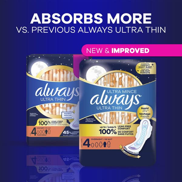 New Always Ultra Thin Overnight Pads provide you a PERFECT NIGHT SLEEP with 45% more back coverage for up to 100% Leak Free Comfort, no matter how you sleep. Are you ready for the unexpected GUSH? New Always Ultra Thin is! With new and improved RapidDRY technology, new Always Ultra Thin absorbs gushes 3X faster (Always Ultra Thin size 2 vs leading size 2 store brand pad) to give you that CLEANER, DRIER, FRESHER pad feeling. And it does that all day long! New Always Ultra Thin is also equiped with LeakGUARD core that locks in leaks for long-lasting protection. Plus, OdorLOCK that helps prevent unwanted odors to help you feel fresh and clean throughout your day! So, why settle when you can choose Always? Always Ultra Thin. Always Gush Ready. Always Ultra Thin Pads come in a range of sizes from 1 to 5 to fit your flow and size perfectly. If you have a light flow or need a teen-sized pad, then we would recommend using our Always Ultra Thin size 1 to 3. If you have a heavy flow or want overnight protection, then we recommend sizing up to our size 4 or 5 Ultra Thin Pad. We’ve got your flow covered day and night for up to 100% leak-free comfort. Always Gush Ready.