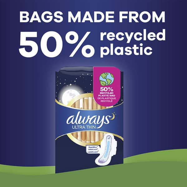 Always Ultra Thin Overnight Pads with Flexi-Wings provide you a PERFECT NIGHT SLEEP with 45% more coverage on the back for up to 100% Leak Free Comfort, no matter how you sleep. All Always Ultra Thin Pads have our 3x Protection System to give you peace of mind day and night. RapidDRY technology absorbs gushes 2X faster than the leading store brand. The LeakGUARD core locks in leaks for long-lasting protection. Plus, OdorLOCK that helps prevent unwanted odors to help you feel fresh and clean throughout your day! Plus Always Ultra Thin Pads come in a range of sizes from 1 to 5 to fit your flow and size perfectly. If you have a light flow or need a teen-sized pad, then we would recommend using our Always Ultra Thin size 1 to 3. If you have a heavy flow or want overnight protection, then we recommend using our size 4 or 5 Ultra Thin Pad. Additionally, all Always Ultra Thin packs are made of 50% recycled plastic and are made at a site that purchases 100% renewable electricity. Remember that all Always Ultra Thin Pads are available in five sizes to fit your flow for 100% leak free comfort.