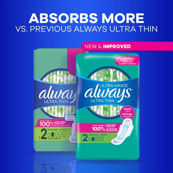 Are you ready for the unexpected GUSH? New Always Ultra Thin is! With new and improved RapidDRY technology, new Always Ultra Thin absorbs gushes 3X faster (Always Ultra Thin size 2 vs leading size 2 store brand pad) to give you that CLEANER, DRIER, FRESHER pad feeling. And it does that all day long! New Always Ultra Thin is also equiped with LeakGUARD core that locks in leaks for long-lasting protection. Plus, OdorLOCK that helps prevent unwanted odors to help you feel fresh and clean throughout your whole day! So, why settle when you can choose Always? Always Ultra Thin. Always Gush Ready. Don’t know which pad size to use? Always Ultra Thin Pads come in a range of sizes from 1 to 5 to fit your flow and size perfectly. If you have a light flow or need a teen-sized pad, then we would recommend using our Always Ultra Thin size 1 to 3. If you have a heavy flow or want overnight protection, then we recommend sizing up to our size 4 or 5 Ultra Thin Pad. We’ve got your flow covered day and night for up to 100% leak-free comfort. Always Ultra Thin pads have up to 8 hours protection. Always Gush Ready, so try Always Ultra Thin.
