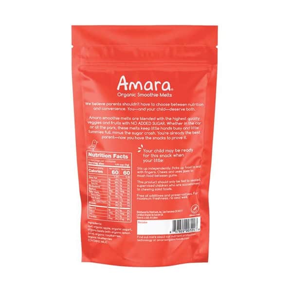 Melts in mouth. We believe moms shouldn’t have to choose between nutrition and convenience. You – and your child – deserve both. That’s why we created on-the-go toddler snacks: to keep your littles happy and healthy, so you can keep super mommin’ it. Amara smoothie melts ore veggie and fruit blends with no added sugar. Whether in the car or at the park, these melts keep little hands busy and little tummies full, minus the sugar crash. You’re already the best mom – now you have the snacks to prove It. Your child may be ready for this snack when your little: Sits up independently. Picks up food to eat with fingers. Chews and uses jaws to mash food between gums. Free of additives and preservatives. For maximum freshness, re-seal well or eat in one sitting.