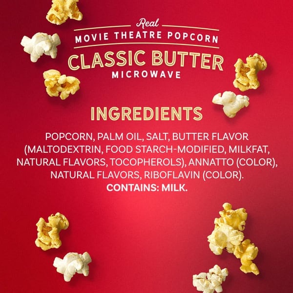 Popcorn, palm oil, salt, butter flavor (maltodextrin, food starch-modified, milkfat, natural flavors, tocopherols), annatto (color), natural flavors, riboflavin (color)