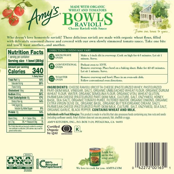 Microwave or regular oven. From our home to yours. Who doesn’t love homestyle ravioli? These delicious ravioli are made with organic wheat flour, filled with delicately seasoned cheese and covered with our own slowly simmered tomato sauce. Take one bite and you’ll want another – and another. Family Owned Since 1987. After the birth of our daughter Amy in 1987, we found there was little time to prepare the quality homemade food we normally ate. Realizing there were others like ourselves, we started Amy’s Kitchen to prepare delicious meals for those who care about the food they eat but are often too busy to cook. We use only the finest ingredients and prepare them with the same careful attention in our kitchen as you would in your own home. No meat, fish, shellfish, poultry, eggs or peanuts are ever used in any Amy’s products.