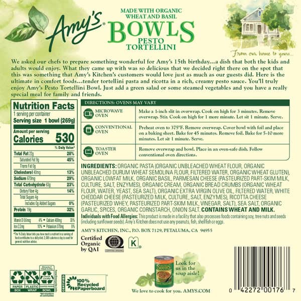 Microwave or regular oven. From our home to you. We asked our chefs to prepare something wonderful for Amy’s 15th birthday – a dish that both the kids and adults would enjoy. What they came up with was so delicious that we decided right there on the spot that this was something that Amy’s Kitchen’s customers would love just as much as our guests did. Here is the ultimate in comfort foods – tender tortellini pasta and ricotta in a rich, creamy pesto sauce. You’ll truly enjoy Amy’s Pesto Tortellini Bowl. Just add a green salad or some steamed vegetables and you have a really special meal for family and friends. Family owned since 1987. After the birth of our daughter Amy in 1987, we found there was little time to prepare the Quality homemade food we normally ate. Realizing there were others like ourselves, we started Amy’s kitchen to prepare delicious meals for those who care about the food they eat but are often too busy to cook. We use only the finest ingredients and prepare them with the same Careful attention in our kitchen as you would in your own home. No meat, fish, shellfish, poultry, eggs or peanuts are ever used in any Amy’s products.
