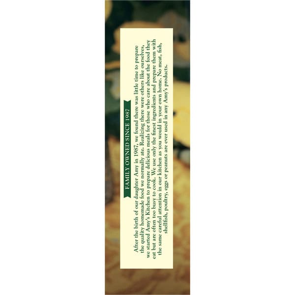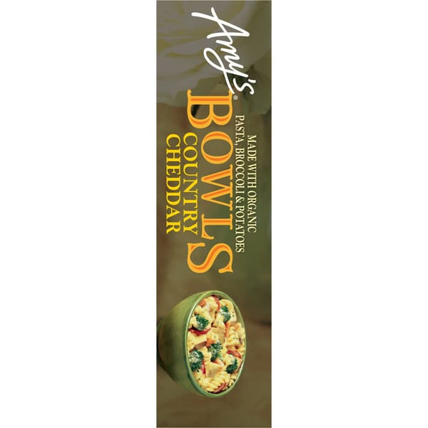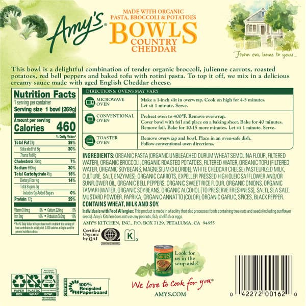 Microwave or regular oven. Family Owned Since 1987. After the birth of our daughter Amy in 1987, we found there was little time to prepare the quality homemade food we normally ate. Realizing there were others like ourselves, we started Amy’s Kitchen to prepare delicious meals for those who care about the food they eat but are often too busy to cook. We use only the finest ingredients and prepare them with the same careful attention in our kitchen as you would in your own home. No meat, fish, shellfish, poultry, eggs or peanuts are ever used in any Amy’s products. Amy’s – From our home to yours. This bowl is a delightful combination of tender organic broccoli, julienne carrots, roasted potatoes, red bell peppers and baked tofu with rotini pasta. To top it off, we mix in a delicious creamy sauce made with aged English Cheddar cheese.