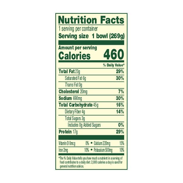 Directions: Ovens may vary. Microwave Oven: Make a 1-inch slit in overwrap. Cook on high for 4.5 minutes. Let sit 1 minute. Serve. Conventional Oven: Preheat oven to 400 degrees F. Remove overwrap. Cover bowl with foil and place on a baking sheet. Bake for 40 minutes. Remove foil. Bake for 10-15 more minutes. Let sit 1 minute. Serve. Toaster Oven: Remove overwrap and bowl. Place in an oven-safe dish. Follow conventional oven directions.