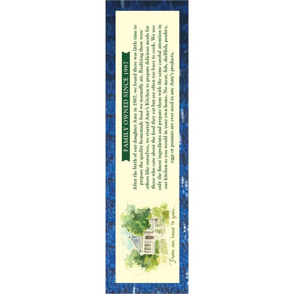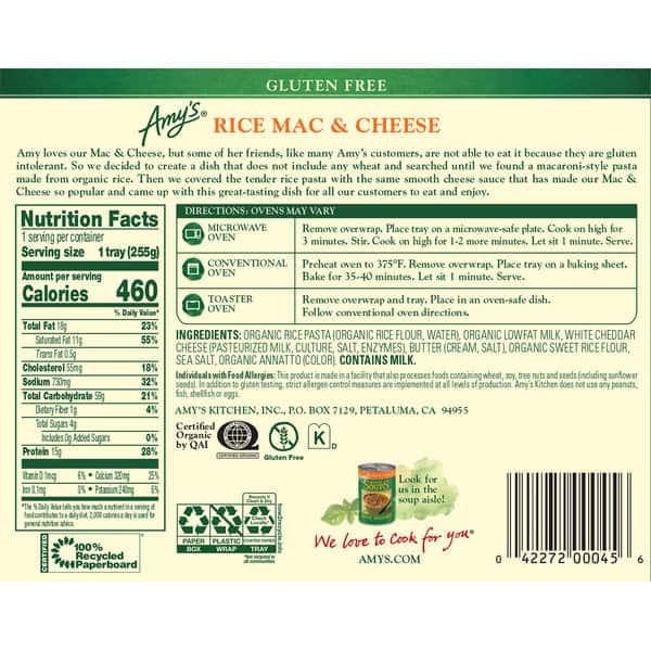 Microwave or regular oven. Amy loves our Mac & Cheese, but some of her friends, like many Amy’s customers, are not able to eat it because they are gluten intolerant. So we decided to create a dish that does not include any wheat, and searched until we found a macaroni-style pasta made from organic rice. Then we covered the tender rice pasta with the same smooth cheese sauce that has made our Mac & Cheese so popular, and came up with this great-tasting dish for all our customers to eat and enjoy. From our home to yours. Family owned since 1987. After the birth of our daughter Amy in 1987, we found there was little time to prepare the quality homemade food we normally ate. Realizing there were others like ourselves, we started Amy’s Kitchen to prepare delicious meals for those who care about the food they eat but are often too busy to cook. We use only the finest ingredients and prepare them with the same careful attention in our kitchen as you would in your own home. No meat, fish, shellfish, poultry, eggs or peanuts are ever used in any Amy’s products.