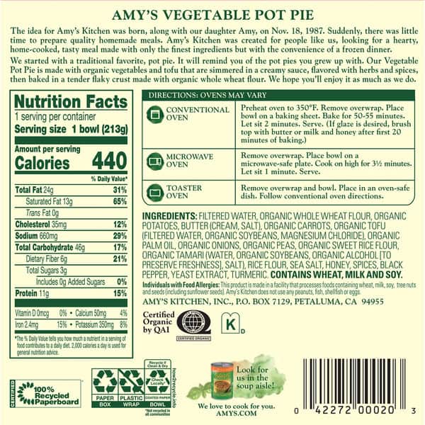 The original vegetable pot pie. The idea for Amy’s Kitchen was born, along with our daughter Amy, on Nov. 18, 1987. Suddenly, there was little time to prepare quality homemade meals. Amy’s Kitchen was created for people like us, looking for a hearty, home-cooked, tasty meal made with only the finest ingredients but with the convenience of a frozen dinner. We started with a traditional favorite, pot pie. It will remind you of the pot pies you grew up with. Our Vegetable Pot Pie is made with organic vegetables and tofu that are simmered in a creamy sauce, flavored with herbs and spices, then baked in a tender flaky crust made with organic whole wheat flour. We hope you’ll enjoy it as much as we do. From our home to yours. Family owned since 1987. After the birth of our daughter Amy in 1987, we found there was little time to prepare the quality homemade food we normally ate. Realizing there were others like ourselves, we set up Amy’s Kitchen to prepare delicious meals for those who care about the food they eat but are often too busy to cook. We use only the finest ingredients and prepare them with the same careful attention in our kitchen as you would in your own home. No meat, fish, shellfish, poultry, eggs or peanuts are ever used in any Amy’s products.