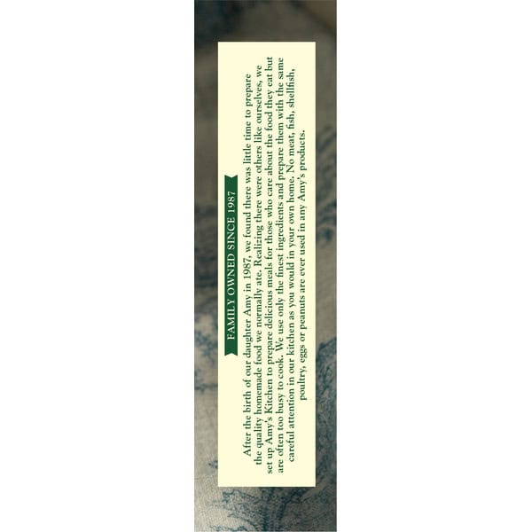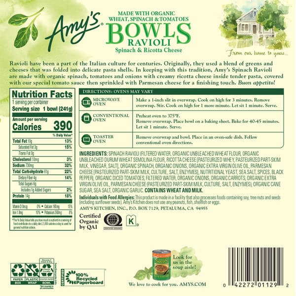 Microwave or regular oven. Family Owned Since 1987. After the birth of our daughter Amy in 1987, we found there was little time to prepare the quality homemade food we normally ate. Realizing there were others like ourselves, we started Amy’s Kitchen to prepare delicious meals for those who care about the food they eat but are often too busy to cook. We use only the finest ingredients and prepare them with the same careful attention in our kitchen as you would in your own home. No meat, fish, shellfish, poultry, eggs or peanuts are ever used in any Amy’s products. From our home to yours. Ravioli have been a part of the Italian culture for centuries. Originally, they used a blend of greens and cheeses that was folded into delicate pasta shells. In keeping with this tradition, Amy’s Spinach Ravioli are made with organic spinach, tomatoes and onions with creamy ricotta cheese inside tender pasta, covered with our special tomato sauce then sprinkled with Parmesan cheese for a finishing touch.