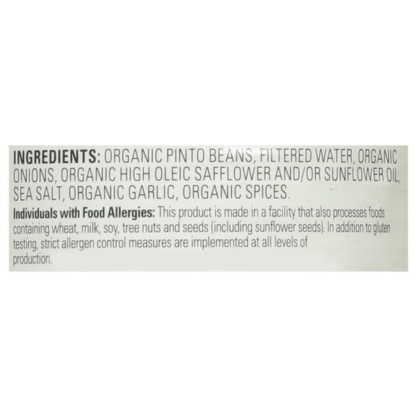 Organic Pinto Beans, Filtered Water, Organic Onions, Organic High Oleic Safflower And/or Sunflower Oil, Sea Salt, Organic Garlic, Organic Spices