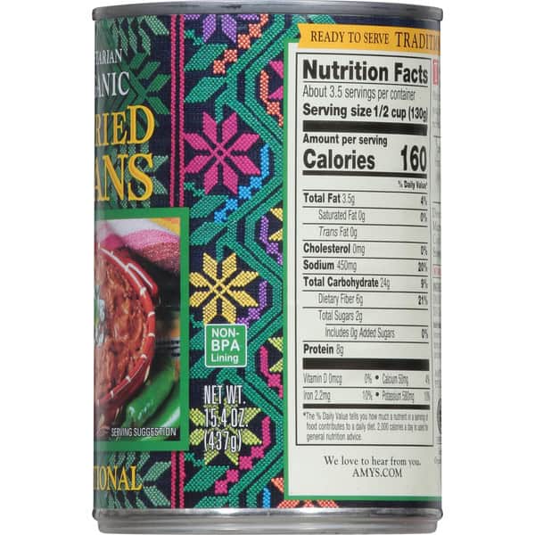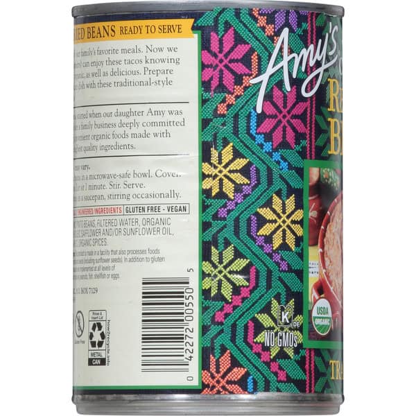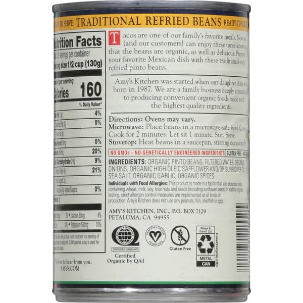 Ready to serve. Tacos are one of our family’s favorite meals. Now we (and our customers) can enjoy these tacos knowing that the beans are organic, as well as delicious. Prepare your favorite Mexican dish with these traditional-style refried pinto beans. Amy’s Kitchen was started when our daughter Amy was born in 1987. We are a family business deeply committed to producing organic foods made with the highest quality ingredients. Non-BPA lining.