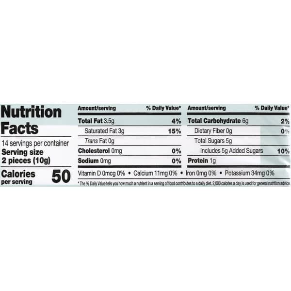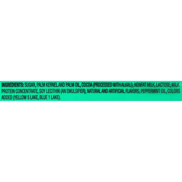 Sugar, Palm Kernel And Palm Oil, Cocoa (processed With Alkali), Nonfat Milk, Lactose, Milk Protein Concentrate, Soy Lecithin (an Emulsifier), Natural And Artificial Flavors, Peppermint Oil, Colors Added (yellow 5 Lake, Blue 1 Lake).