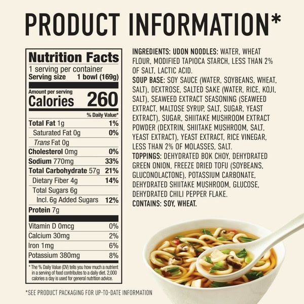 Udon Noodles: Water, Wheat Flour, Modified Tapioca Starch, Less Than 2% Of Salt, Lactic Acid. Soup Base: Soy Sauce (water, Soybeans, Wheat, Salt), Dextrose, Salted Sake (water, Rice, Koji, Salt), Seaweed Extract Seasoning (seaweed Extract, Maltose Syrup, Salt, Sugar, Yeast Extract), Sugar, Shiitake Mushroom Extract Powder (dextrin, Shiitake Mushroom. Salt, Yeast Extract), Yeast Extract, Rice Vinegar, Less Than 2% Of Molasses, Salt. Toppings: Dehydrated Bok Choy, Dehydrated Green Onion, Freeze Dried Tofu (soybeans, Gluconolactone), Potassium Carbonate, Dehydrated Shiitake Mushroom, Glucose, Dehydrated Chili Pepper Flake.