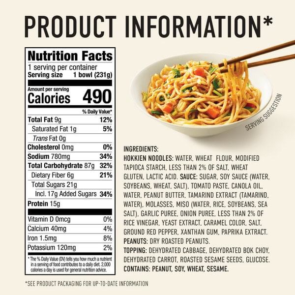 Hokkien Noodles: Water, Wheat Flour, Modified Tapioca Starch, Less Than 2% Of Salt, Wheat Gluten, Lactic Acid. Sauce: Sugar, Soy Sauce (water, Soybeans, Wheat, Salt), Tomato Paste, Canola Oil, Water, Peanut Butter, Tamarind Extract (tamarind, Water), Molasses, Miso (water, Rice, Soybeans, Sea Salt), Garlic Puree, Onion Puree, Less Than 2% Of Rice Vinegar, Yeast Extract, Caramel Color, Salt, Ground Red Pepper, Xanthan Gum, Paprika Extract. Peanuts: Dry Roasted Peanuts. Topping: Dehydrated Cabbage, Dehydrated Bok Choy, Dehydrated Carrot, Roasted Sesame Seeds, Glucose.