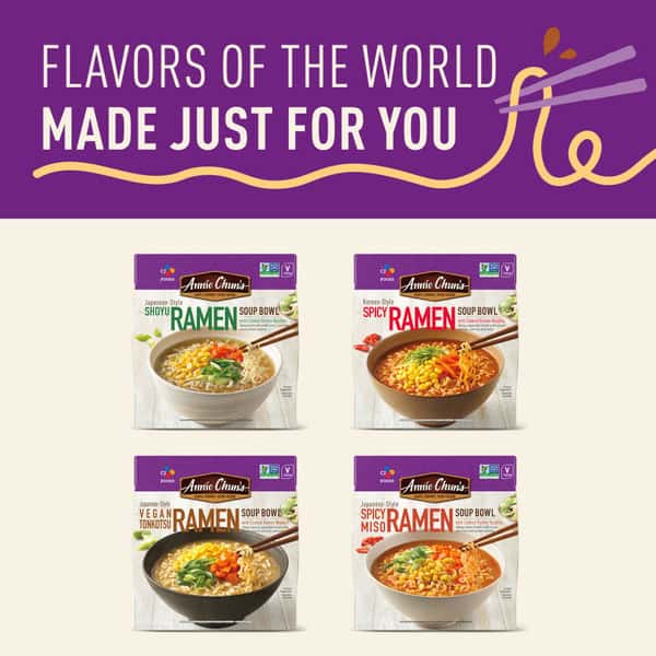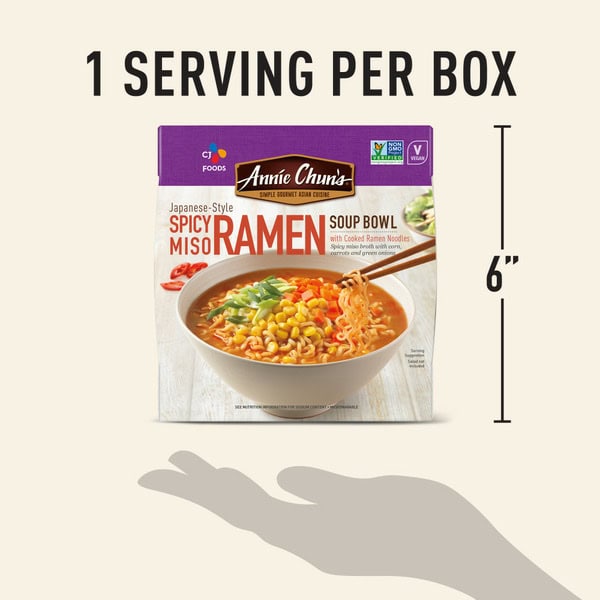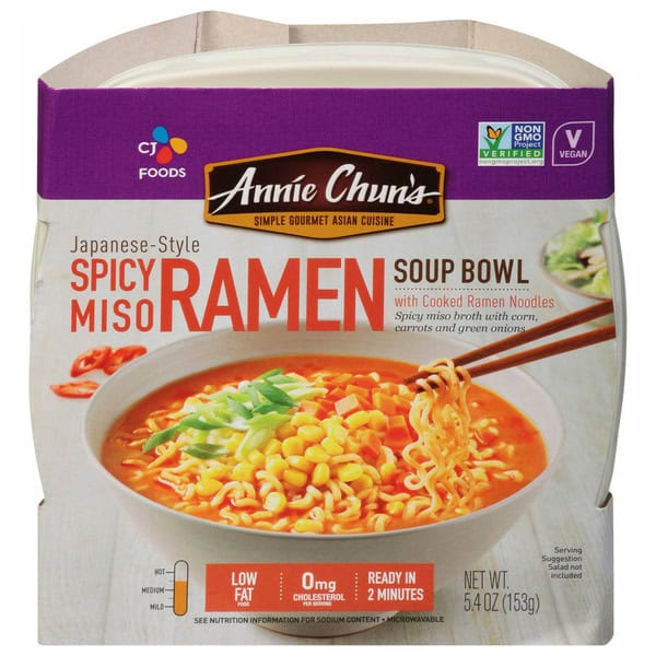 Crafted with care, our Japanese Style Spicy Miso Ramen Bowl boasts a harmonious blend of our rich and savory broth, with ramen noodles that are never fried or dried and are vacuum sealed for freshness. Our tasty medley of delicious corn, carrots, and green onions with an added kick of heat and tender noodles. Enjoy a dish that is crafted with care – whether you’re on-the-go or seeking a quick culinary escape. Immerse yourself in an authentic dish that captures the essence of Asian food culture while relishing in the convenience. With ANNIE CHUN’S Japanese Style Spicy Miso Ramen Bowl, you’re embarking on a flavor journey that’s rooted in tradition and crafted for modern living. Embrace the perfect balance of taste, your search for the ultimate microwavable delight ends here. Explore the other amazing Asian classics like ANNIE CHUN’S Soup Bowls, Noodle Bowls, Organic Seaweed Snacks, and Organic Nori.