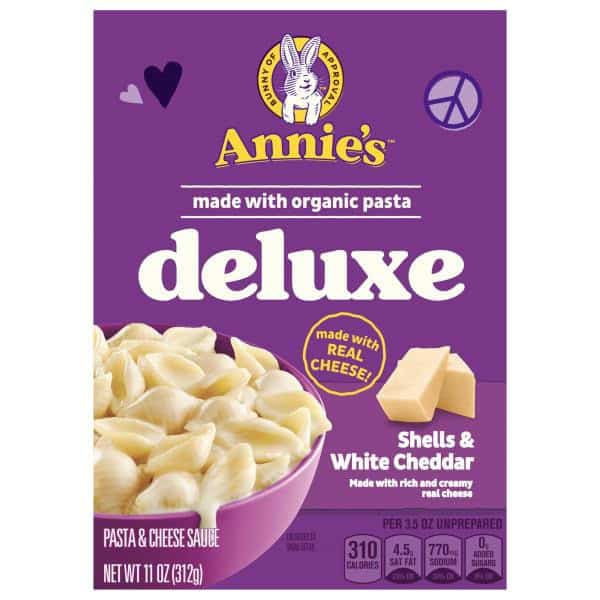 Annie’s Deluxe Mac and Cheese with Organic Pasta and Real White Cheddar Sauce and Shells is the way to level up a childhood favorite food. Made with organic pasta plus rich and creamy real cheese sauce, you can enjoy all the cheesy flavor of this comfort food without compromising on taste. This pasta and cheese sauce contains no artificial flavors or synthetic colors. Prepare a bowl of cheesy shells and cheese pasta as a part of kids dinners, snacks, and more! Enjoy yum in about 9 minutes. Simply cook and drain pasta, stir in cheese sauce, and serve as a tasty addition to quick adult or kids lunch. Keep boxes of our macaroni and cheese in your pantry so you can add joy-filled moments to your day by spooning up the magic, anytime. Annie’s makes products in over 20 family-friendly categories, from fruit-flavored snacks and cereal to mac and cheese. For busy bunnies and families on the go, we help make life a little easier and more delicious by spreading goodness through tasty foods and kindness to the planet.