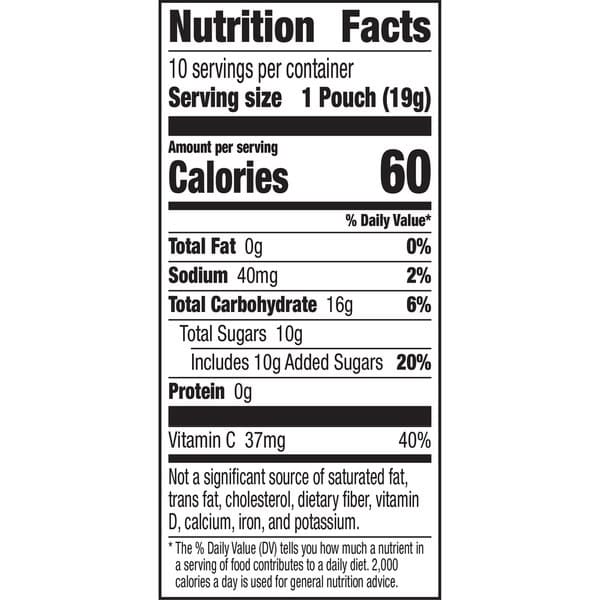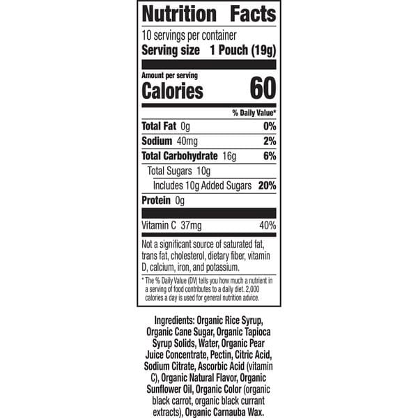 Organic Rice Syrup, Organic Cane Sugar, Organic Tapioca Syrup Solids, Water, Organic Pear Juice Concentrate, Pectin, Citric Acid, Sodium Citrate, Ascorbic Acid (vitamin C), Organic Natural Flavor, Organic Sunflower Oil, Organic Color (organic Black Carrot, Organic Black Currant Extracts), Organic Carnauba Wax