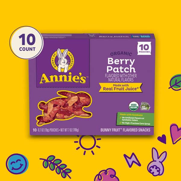 • CONTAINS: One 7 oz box of Annie’s Organic Berry Patch Bunny Fruit Flavored Snacks; 10 pouches