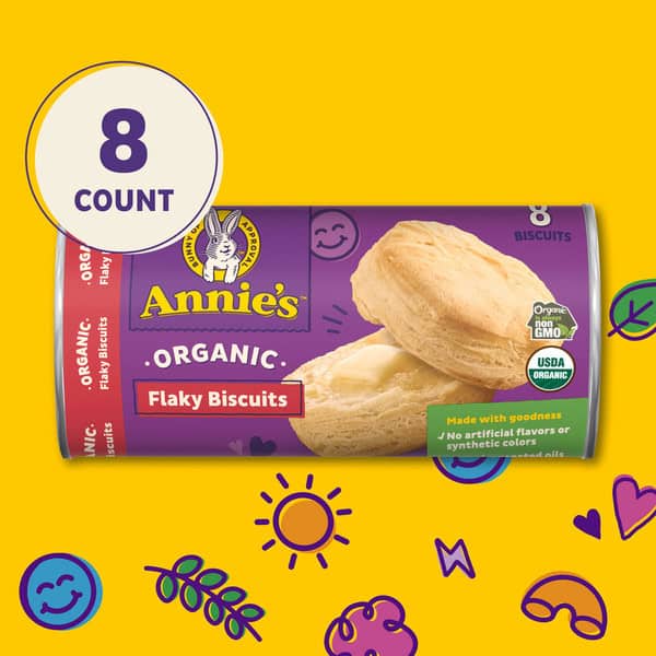 Jam out with Annie’s Organic Flaky Biscuits! Fluffy and airy-light with a buttery taste, Annie’s organic biscuits are best friends with sweet jams, savory hams, and everything in between. These scrumptious biscuits are sure to be a hit with the entire family! Plus, the non-GMO and certified USDA Organic biscuit dough is made with no artificial flavors, synthetic colors, or hydrogenated oils. Nothing but the flaky, fluffy wonder of fresh-baked Annie’s biscuits. This cannister gives you eight flaky biscuits. Annie’s makes products in over 20 family-friendly categories, from fruit flavored snacks and cereal to mac and cheese. For busy bunnies and families on the go, we help make life a little easier and more delicious by spreading goodness through tasty foods and kindness to the planet.
