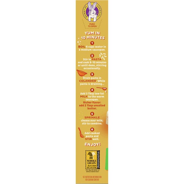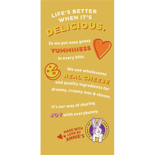 Bring creamy, cheesy goodness to your family dinner table with Annie’s Butter and Parmesan Spirals Macaroni and Cheese. Made with organic pasta, creamy butter and real Parmesan cheese, Annie’s mac and cheese offers a great-tasting adult and kids dinner option that is crafted with lots of care and packed with irresistible flavor. Annie’s mac and cheese with organic pasta contains cheese from cows not treated with rBST*, offering quality ingredients in every tasty bite. This pasta and cheese dinner side contains no artificial flavors or synthetic colors for a tasty serving of Annie’s macaroni and cheese you can feel good about. Kids and adults will love the rich combination of real cheese and spiral pasta, making it perfect for lunchtime, dinnertime or anytime you’re in the mood for something downright delicious. Annie’s mac and cheese is ready in just ten minutes, helping you spend less time in the kitchen so you can enjoy quality time sharing a meal with your family. All you have to do is boil the pasta in water and drain in a colander. Heat three tablespoons of lowfat milk in a medium saucepan and mix in the cheese packet. Then, add the cooked pasta to the saucepan and stir well to combine. Serve Annie’s mac n cheese as a side dish, use it to prepare baked bacon mac and cheese for your next family meal, or pair it with other kids food favorites like chicken nuggets. This five-and-a-quarter-ounce box is easy to store in the pantry and contains about two servings for a quick kids mac and cheese dinner option. Annie’s macaroni and cheese dinner side is an official Box Tops For Education participating product. Download the Box Tops App to learn more and start earning cash for schools in need today. Annie’s Homegrown is devoted to spreading goodness through kindness to the planet and creating tasty foods for everybunny.
