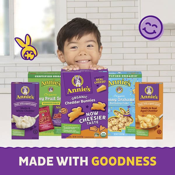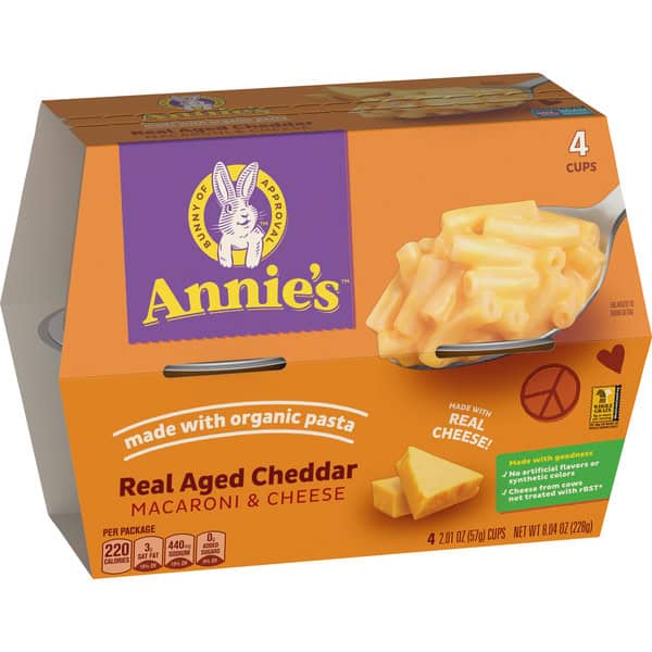 Annie’s Real Aged Cheddar Microwave Mac and Cheese Cups make family dinner and kids snack time easy and delicious. Each Annie’s mac and cheese cup offers organic pasta and flavorful aged cheddar cheese with a creamy, dreamy taste that is impossible to resist. Annie’s microwavable mac and cheese is crafted with care and made with real cheese from cows not treated with rBST*, offering quality ingredients in every cup. With no artificial flavors or synthetic colors, you can feel good about serving and enjoying a tasty and wholesome cup of Annie’s mac and cheese. Annie’s macaroni and cheese cups are perfect for lunchtime, dinnertime or anytime you’re in the mood for something downright delicious. These microwave mac and cheese cups are ready in minutes, making them a great-tasting adult and kids food option for busy bunnies and families on the go. Simply remove the cup lid, add cold water to the fill line and stir. Microwave on high for two minutes, mix in the cheese packet and enjoy as a snack or paired with a kid-friendly protein like chicken nuggets. This convenient adult and kids mac and cheese pack comes with four cups you can easily store in a pantry or throw into a backpack for an on-the-go snack. Annie’s makes products in over 20 family-friendly categories, from fruit-flavored snacks and cereal to mac and cheese. For busy bunnies and families on the go, we help make life a little easier and more delicious by spreading goodness through tasty foods and kindness to the planet. *No significant difference has been shown between milk derived from rBST-treated and non rBST-treated cows.