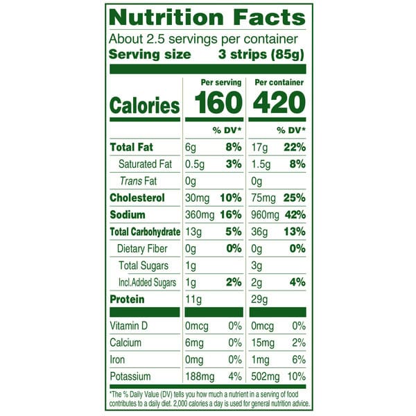 Oven (Preferred): Preheat oven to 425°F. Place frozen chicken strips in a single layer on a baking sheet brushed lightly with oil. Bake for about 18 minutes, or to desired color and crispiness, turning strips over halfway through cooking time. Microwave: Microwave: Place frozen chicken strips in a single layer on a paper towel on a microwave-safe plate. Set microwave to high heat. Heat until hot, 2–2-1/2 minutes, turning strips over halfway through cooking time.