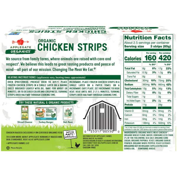 Formed & breaded organic white meat chicken patties. USDA Organic. Chicken raised exclusively on certified organic feed. Casein free. Certified Organic by Quality Assurance International. Non-GMO Project verified (Chicken raised & fed a diet in compliance with the non-GMO project standard for avoidance of genetically engineered ingredients). nongmoproject.org. Chicken raised with no antibiotics ever (Chicken never administered antibiotics or fed animal by-products). Applegate humanely raised (Chicken raised on organic vegetarian feed, on family farms, with at least 24% more space than industry standard and environmental enrichments to promote natural behaviors and well-being). Made with only white meat chicken. Fully cooked. Ready to heat. Microwavable. We source from family farms, where animals are raised with care and respect (Chicken raised on organic vegetarian feed, on family farms, with at least 24% more space than industry standard and environmental enrichments to promote natural behaviors and well-being). We believe this leads to great tasting products and peace of mind – all part of our mission. Changing the meat we eat. We’re anti-antibiotics. Inspected for wholesomeness by U.S. Department of Agriculture. applegate.com. To learn more about Applegate humanely raised and our standards, visit us at applegate.com. Questions? Visit help.applegate.com or call 866-587-5858. Try These Natural & Organic Products: Sliced cheese; Turkey Burger; Deli meat. Please recycle. Applegate Organic Chicken Strips are lightly seasoned with salt and pepper, and coated with organic bread crumbs to bake up crispy and delicious. These frozen chicken strips are fully cooked and ready to heat in your microwave.