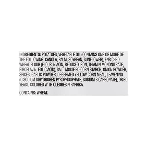 Potatoes, Vegetable Oil (contains One Or More Of The Following: Canola, Palm, Soybean, Sunflower), Enriched Wheat Flour (flour, Niacin, Reduced Iron, Thiamin Mononitrate, Riboflavin, Folic Acid), Salt, Modified Corn Starch, Onion Powder, Spices, Garlic Powder, Degermed Yellow Corn Meal, Leavening (disodium Dihydrogen Pyrophosphate, Sodium Bicarbonate), Dried Yeast, Colored With Oleoresin Paprika.