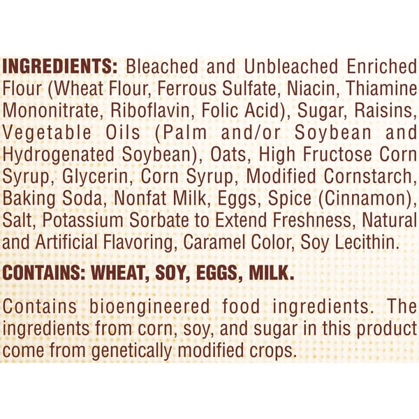 Bleached And Unbleached Enriched Flour (wheat Flour, Ferrous Sulfate, Niacin, Thiamine Mononitrate, Riboflavin, Folic Acid), Sugar, Raisins, Vegetable Oils (palm And/or Soybean And Hydrogenated Soybean), Oats, High Fructose Corn Syrup, Glycerin, Corn Syrup, Modified Cornstarch, Baking Soda, Nonfat Milk, Eggs, Spice (cinnamon), Salt, Potassium Sorbate To Extend Freshness, Natural And Artificial Flavoring, Caramel Color, Soy Lecithin
