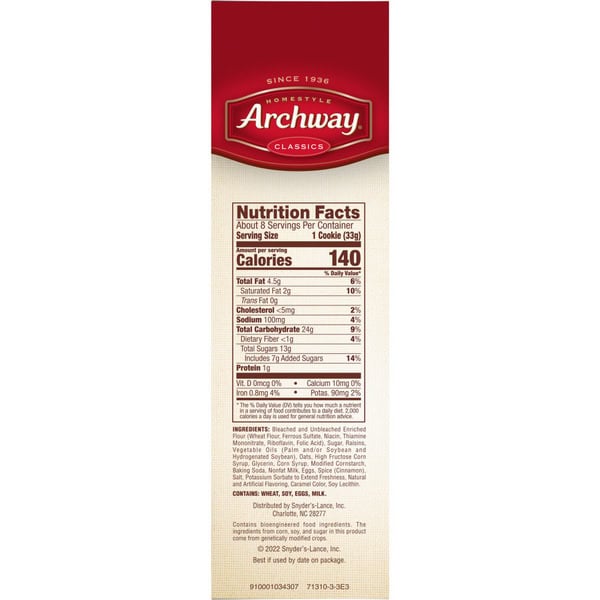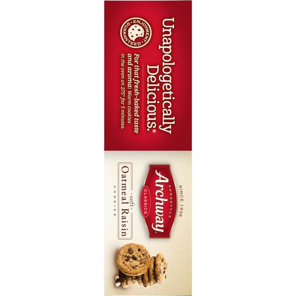 Juicy raisins in a classic oatmeal batter give you Archways Oatmeal Raisin cookies a mouthwatering homestyle treat. Thick and rich, this is a classic Archway cookie you’ll know by the sweet aroma when you first open up the package. Since 1936, Archway Cookies have been winning the hearts of cookies lovers. Known for our home-style goodness, we strive to deliver high quality, highly enjoyable cookies with the ability to bring on nostalgic memories every single day.