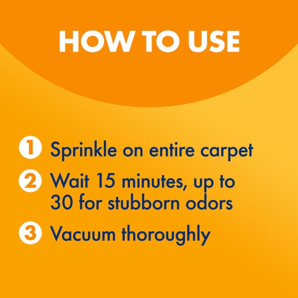 Directions: For maximum odor elimination, sprinkle on entire carpet, wait 15 minutes, then vacuum thoroughly. For best results, use every time you vacuum. For especially stubborn odors, sprinkle liberally on carpet, wait 30 minutes and vacuum. Do not use on wet or damp carpets. Also use this product on: Upholstered furniture. Automobile carpeting. Garbage cans and disposals.