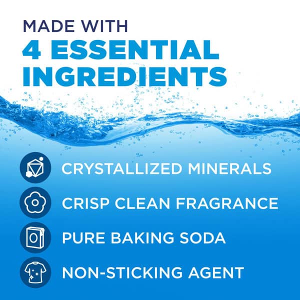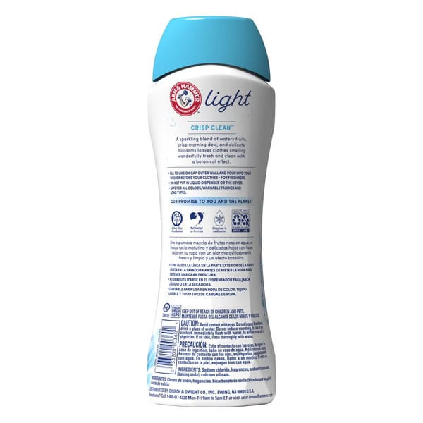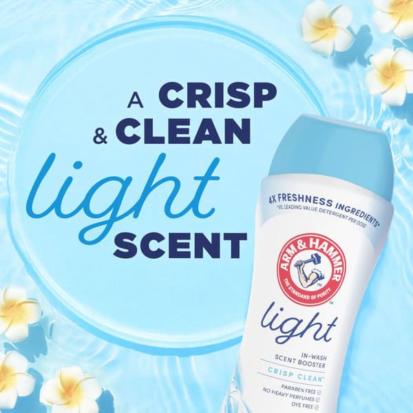 Freshen every load without heavy perfumes when you add ARM & HAMMER Light InWash Scent Booster to every load. Unlike other laundry scent boosters, it delivers a light yet long-lasting Crisp Clean scent with 4X the freshness ingredients vs. the leading value detergent per dose. Its sparkling blend of watery fruits, crisp morning dew, and delicate blossoms leaves clothes smelling wonderfully fresh and clean with a botanical effect. These laundry crystals are made with just 4 essential ingredients—crystallized minerals, pure ARM HAMMER Baking Soda, a non-sticking agent, and a crisp and clean light fragrance–but contain no heavy perfumes, no dyes, and no