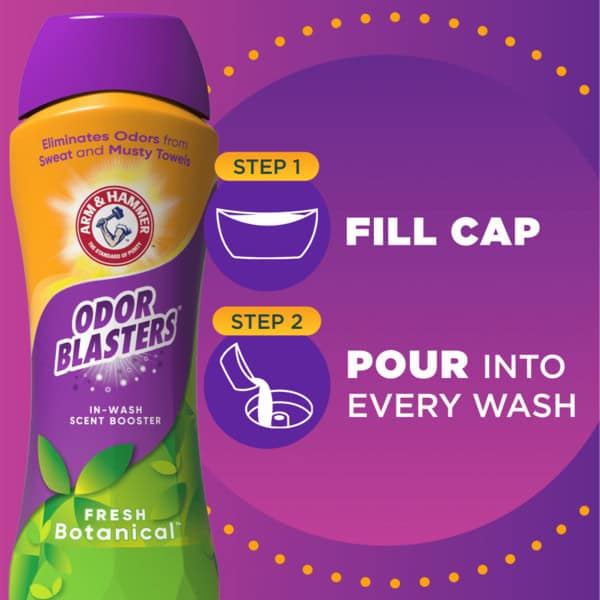 Eliminate odors and add a burst of lasting freshness to your laundry routine with ARM & HAMMER Odor Blasters In-Wash Scent Booster in Fresh Botanical scent. This laundry