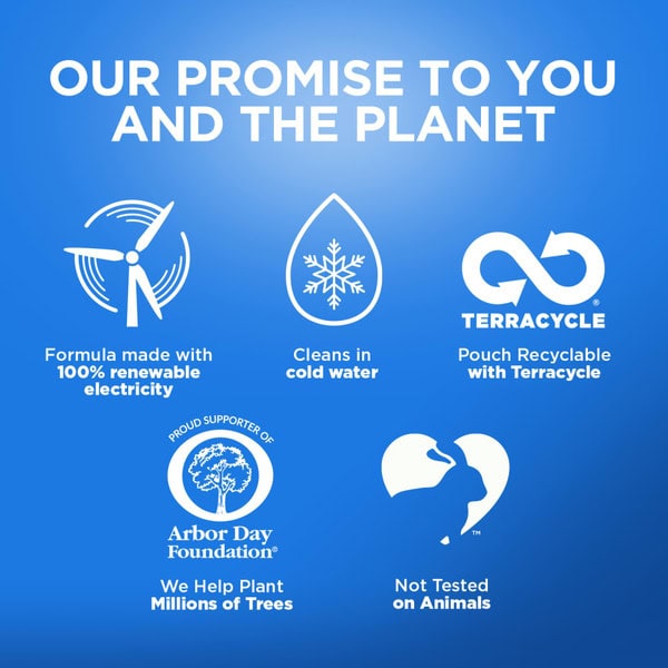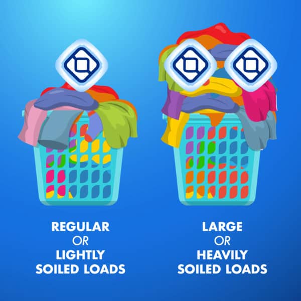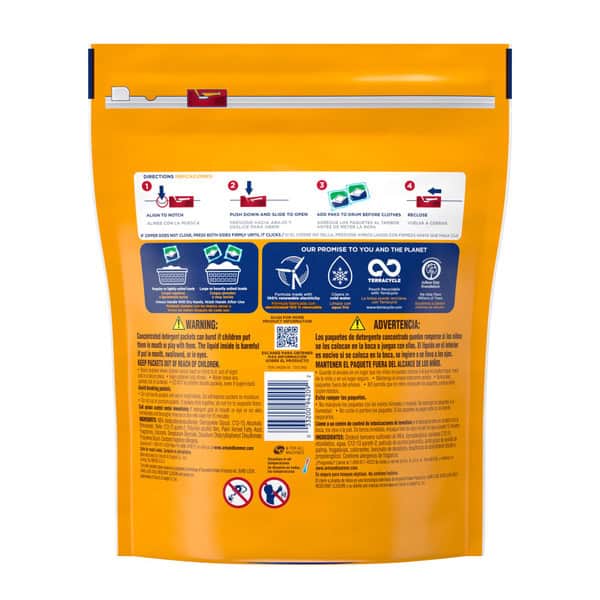 Directions: 1. Align to notch. 2. Push down and slide to open. 3. Add paks to drum before clothes. 4. reclose. If zipper does not close, press both sides firmly until it clicks. 1 Pack: Regular or lightly soiled loads. 2 Packs: Large or heavily soiled loads. Always handle with dry hands, wash hands after use. Safe for septic tanks.