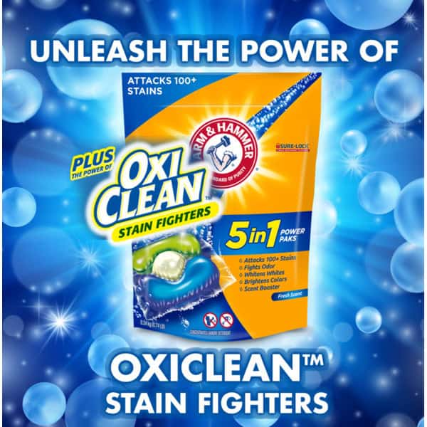 ARM & HAMMERâ„¢ Plus OxiCleanâ„¢ 5-in-1 Power Paks offer 5 powerful cleaning benefits in 1: Attacks stains, fights odors, whitens whites, brightens colors, with a powerful fresh scent booster. Powered by OxiCleanâ„¢ Stain Fighters to remove 100+ stains leaving clothes clean and smelling great. Get effective cleaning power with ARM & HAMMERâ„¢ Plus OxiCleanâ„¢ 5-in-1 Power Paks, designed to work in all temperatures and all machines. Drop one in today!