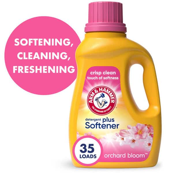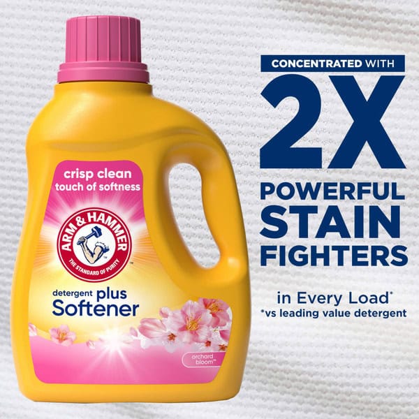 Get clothes powerfully clean with a softer side. With the proven power you want, this washing liquid plus a touch of softener removes the toughest stains and attacks odors with ARM & HAMMER Baking Soda. ARM & HAMMER Plus a touch of Softener is concentrated with 2X powerful stain fighters in every load versus the leading value detergent. You’ll get just the right amount of detergent and a touch of fabric softener all in one bottle—perfect for any load. Plus it’s uniquely formulated to work in both standard washers and today’s energy-conscious High Efficiency (HE) machines. Start getting clean, fresh smelling clothes, now wonderfully soft, too. Enjoy its Orchard Bloom Scent that makes your laundry smell like a garden full of floral freshness.