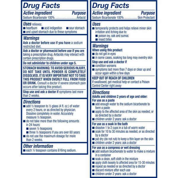 Directions: Add 1/2 teaspoon to 1/2 glass (4 fl. oz.) of water every 2 hours, or as directed by physician. Dissolve completely in water. Accurately measure 1/2 teaspoon. Do not take more than the following amounts in 24 hours: seven 1/2 teaspoons; three 1/2 teaspoons if you are over 60 years. Do not use the maximum dosage for more than 2 weeks. Directions: For use as a soak in bath: dissolve 1 to 2 cups in a tub of warm water; soak for 10 to 30 minutes as needed, or as directed by a doctor; pat dry (do not rub) to keep a thin layer on the skin. For use as a compress or wet dressing: add sodium bicarbonate to water to make a mixture in a container; soak a clean, soft cloth in the mixture; apply cloth loosely to affected area for 15-30 minutes; repeat as needed or as directed by doctor; discard mixture after each use. Adults and Children 2 Years of Age and Older: For Use as Paste: Add enough water to the sodium bicarbonate to form a paste. Apply to the affected are of the skin as needed, or as directed by doctor. Children Under 2 Years: Ask a Doctor.