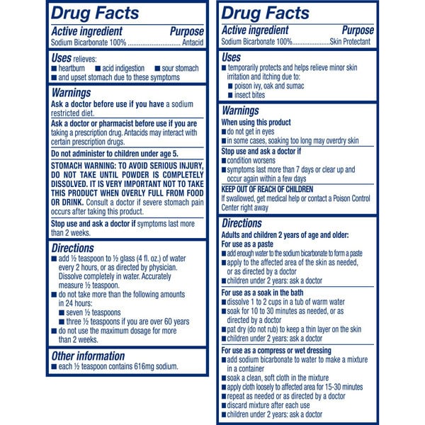 Directions: Add 1/2 teaspoon to 1/2 glass (4 fl. oz.) of water every 2 hours, or as directed by physician. Dissolve completely in water. Accurately measure 1/2 teaspoon. Do not take more than the following amounts in 24 hours. Seven 1/2 teaspoons. Three 1/2 teaspoons if you are over 60 years. Do not use the maximum dosage for more than 2 weeks. Directions: Adults and children 2 years of age and older: For use as a paste: Add enough water to the sodium bicarbonate to form a paste. Apply to the affected area of the skin as needed, or as directed by a doctor. For use as a soak in the bath: Dissolve 1 to 2 cups in a tub of warm water. Soak for 10 to 30 minutes as needed, or as directed by a doctor. Pat dry (do not rub) to keep a thin layer on the skin. For use as a compress or wet dressing: Add sodium bicarbonate to water to make a mixture in a container. Soak a clean, soft cloth in the mixture. Apply cloth loosely to affected area for 15-30 minutes. Repeat as needed or as directed by a doctor. Discard mixture after each use. Children Under 2 Years: Ask a doctor.
