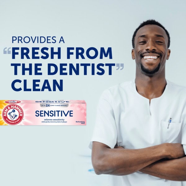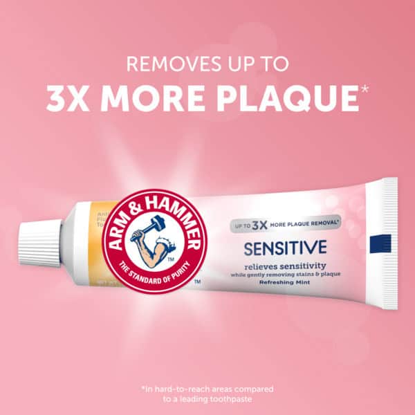 ARM & HAMMERâ„¢ Sensitive anticavity fluoride toothpaste is formulated with an FDA-approved active ingredient to protect and relieve tooth sensivity providing MAXIMUM SENSITIVITY RELIEF – without a prescription. Naturally powered by 100% pure baking soda, our toothpastes go beyond cleaning, giving you stronger, healthier teeth and gums. Unlike regular fluoride toothpaste, our pure baking soda formulas penetrate deeper throughout your mouth, REMOVING UP TO 3X MORE PLAQUE in hard-to-reach places.* Best of all, we do this gently, and are less abrasive than other toothpastes. *in hard-to-reach areas compared to a leading toothpaste **Data on file