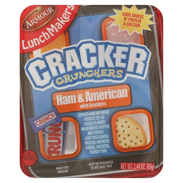 Armour LunchMakers Ham and Cheese Portable Meal Kit with Crunch Bar includes everything you need for a fun snack at home or on the go. These kids lunch meals include ham deli meat, American cheese slices and crackers for delicious sandwich stacking, plus a Crunch Bar serves as a scrumptious dessert. These Armour Lunch cheese and crackers snacks provide a delicious meal or snacktime option that is a good source of both protein and calcium. LunchMakers to go snacks require no meal preparation, making them ideal for kids, whether at home, at school lunch or on the go. Just peel back the plastic film and assemble your cracker sandwiches for quick lunch snacks for kids. One Armour LunchMakers Ham and Cheese Portable Meal Kit with Crunch Bar serves one person. Keep Armour LunchMakers Ham Portable Meal Kit to go lunches refrigerated to maintain freshness.