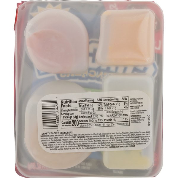 Armour LunchMakers Turkey and Cheese Portable Meal Kit with Crackers and Butterfinger includes everything you need for a fun snack at home or on the go. The lunch kits for kids feature turkey lunchmeat, American cheese slices and crackers for delicious sandwich stacking, plus a Butterfinger candy bar for a scrumptious dessert. This Armour lunch on the go provides a delicious meal or snacktime option that is a good source of both protein and calcium. The cheese and crackers snacks require no meal preparation, ideal for school lunches or to go snacks. Just peel back the plastic film and assemble your cracker sandwiches for a convenient lunch snack or meal. One Armour LunchMakers Turkey and Cheese Portable Meal Kit with Crackers and Butterfinger serves one person. Refrigerate Armour LunchMakers to go lunches to maintain freshness.