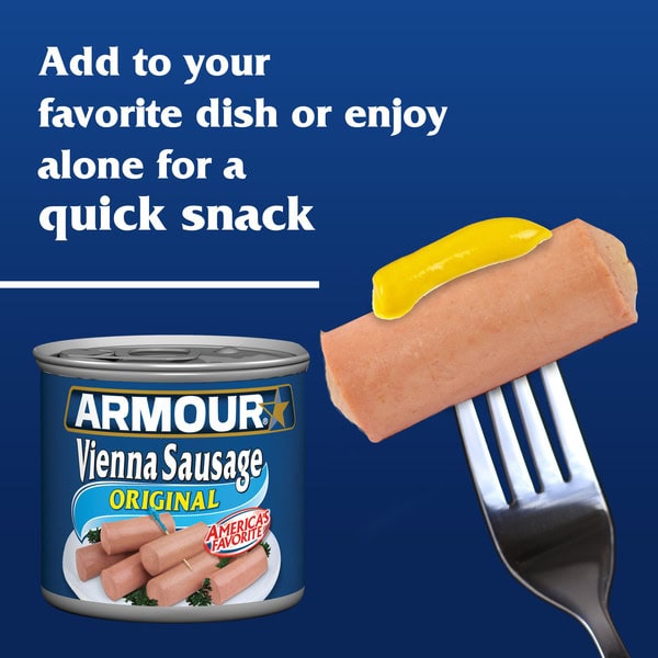 Armour Star Vienna Sausage Original Flavored Canned Sausages offer ready-to-eat Vienna sausage links with great flavor. This delicious and convenient canned meat is gluten free and made with chicken, beef and pork added in chicken broth. Our tasty Vienna sausages can be eaten right out of the can, so you can enjoy this meat snack as backpacking food, camping food and even survival food as a part of your emergency food supply. Try adding these sausages to your favorite recipes, or serve as an easy appetizer everyone will enjoy. Store this canned food in your pantry so you’ll always have some delicious Vienna sausage links on hand. Keep these Vienna sausages refrigerated after opening to keep fresh for next time. Make any time Armour Star time!