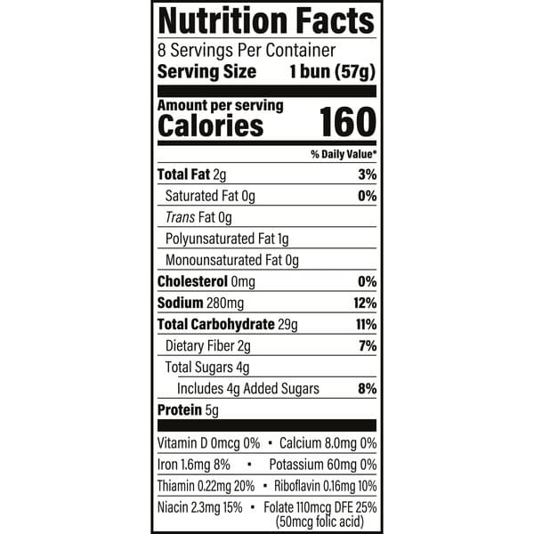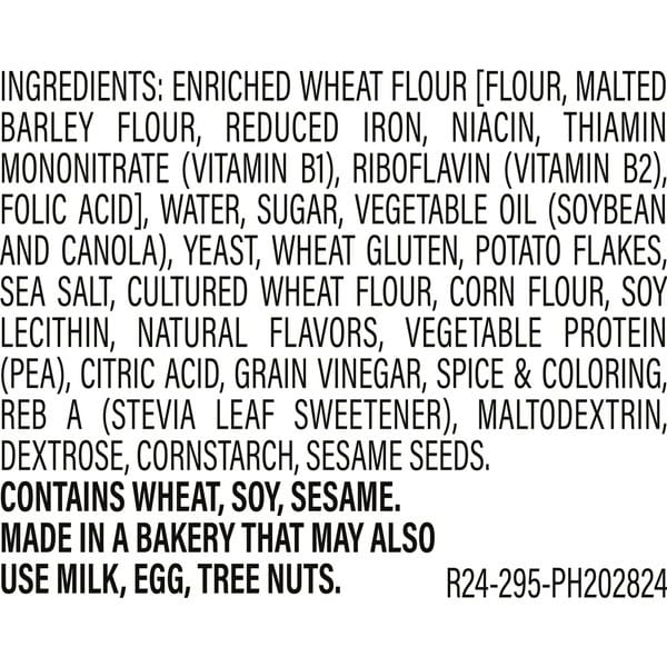 Enriched Wheat Flour [flour, Malted Barley Flour, Reduced Iron, Niacin, Thiamin Mononitrate (vitamin B1), Riboflavin (vitamin B2), Folic Acid], Water, Sugar, Vegetable Oil (soybean And Canola), Yeast, Wheat Gluten, Potato Flakes, Sea Salt, Cultured Wheat Flour, Corn Flour, Soy Lecithin, Natural Flavors, Vegetable Protein (pea), Citric Acid, Grain Vinegar, Spice & Coloring, Reb A (stevia Leaf Sweetener), Maltodextrin, Dextrose, Cornstarch, Sesame Seeds
