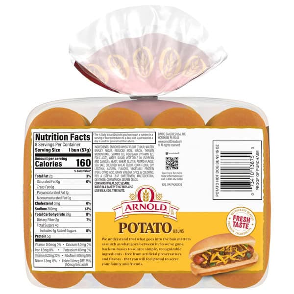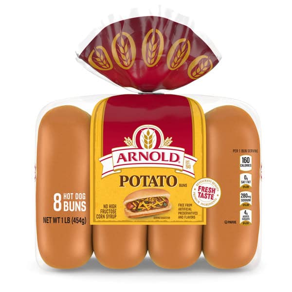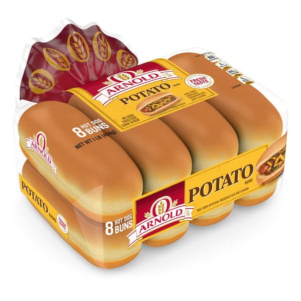 8 Pre-sliced potato Hot Dog Buns. Baked with Premium Ingredients and Free from Artificial colors, flavors and preservatives.