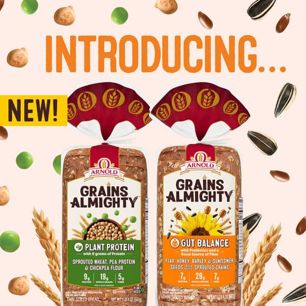 Arnold Grains Almighty Plant Protein bread is a delicious bread that’s made with a sprouted grain blend and a natural prebiotic fiber, keeping your digestive health in mind.
