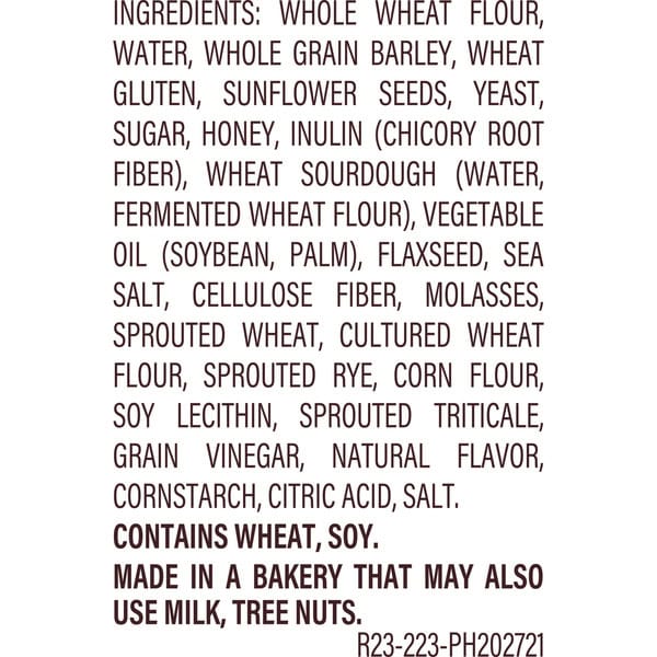 Whole Wheat Flour, Water, Barley, Wheat Gluten, Sunflower Seeds, Inulin (chickory Root Fiber), Yeast, Sugar, Honey, Wheat Sourdough (water, Fermented Wheat Flour), Vegetable Oil (soybean, Palm), Flaxseed, Sea Salt, Sprouted Wheat, Molasses, Cultured Wheat Flour, Sprouted Rye, Corn Flour, Sprouted Triticale, Soy Lecithin, Grain Vinegar, Natural Flavors, Cornstarch, Citric Acid, Salt