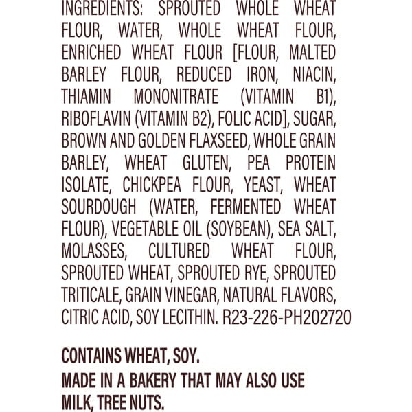 Sprouted Whole Wheat Flour, Water, Whole Wheat Flour, Enriched Wheat Flour [flour, Malted Barley Flour, Reduced Iron, Niacin, Thiamin Mononitrate (vitamin B1), Riboflavin (vitamin B2), Folic Acid], Sugar, Brown And Golden Flaxseed, Whole Grain Barley, Wheat Gluten, Pea Protein Isolate, Chickpea Flour, Yeast, Wheat Sourdough (water, Fermented Wheat Flour), Vegetable Oil (soybean), Salt, Molasses, Cultured Wheat Flour, Sprouted Wheat, Sprouted Rye, Sprouted Triticale, Grain Vinegar, Natural Flavors, Citric Acid, Soy Lecithin